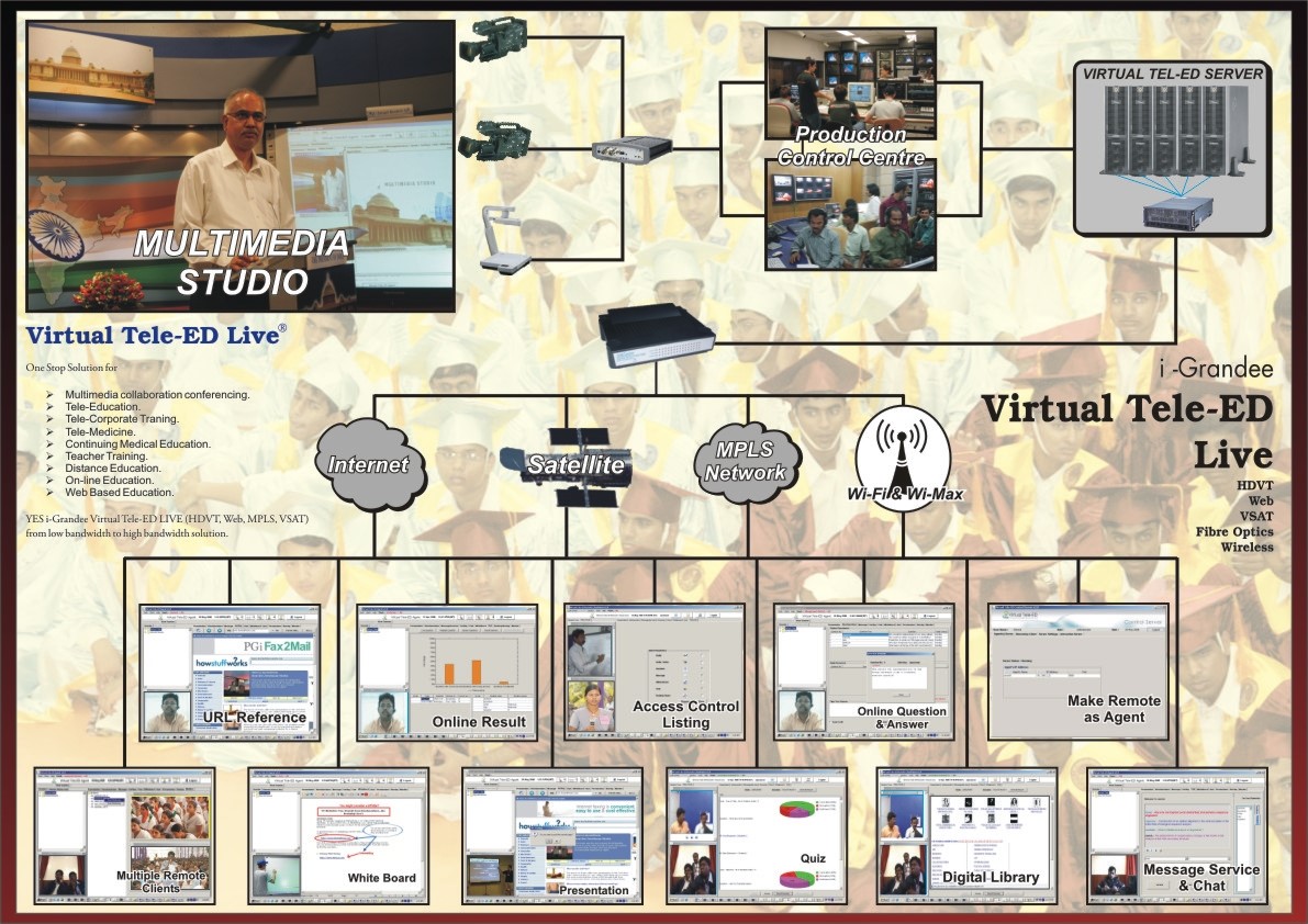 - Provides multicast mode of delivery of live lecture sessions to the multiple remote virtual classrooms in an integrated environment with High definition video, audio, content and collaborative tools. The return video and audio from the remote students shall be through on-demand selection